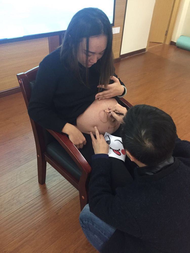 五组家庭勇跃前来,准爸爸们在准妈妈的肚皮上用人体彩绘颜料作画